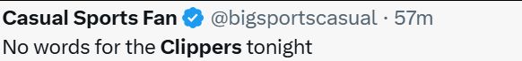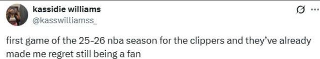 “这是快船队 25-26 赛季的第一场比赛,他们已经让我后悔自己还是他们的球迷了”。